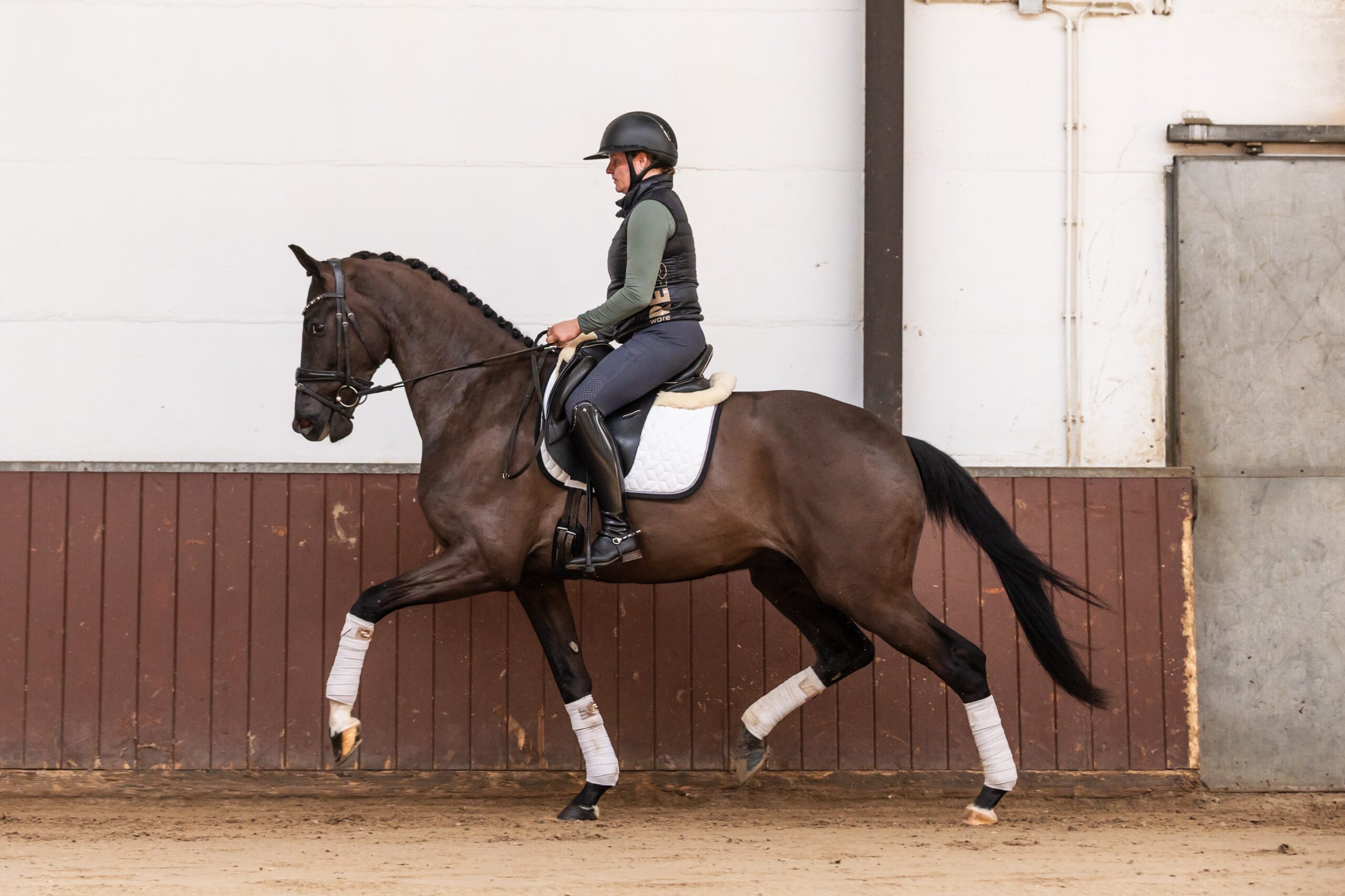 This super brave and honest 4-year-old gelding is a lovely young horse with a fantastic attitude. He is well-behaved under saddle, though still a touch green—as expected for his age. His kind and genuine character, he gives a very safe feeling, both in the arena and outside. He shows good paces, with a very good, uphill canter, a trot with nice swing, and a walk with clear overtrack. At this stage, he would benefit from developing more suppleness through his body, which will naturally improve with time and correct training. He has a great mindset, and for a rider with some experience with young horses, he could be suitable for a wide range of riders.
