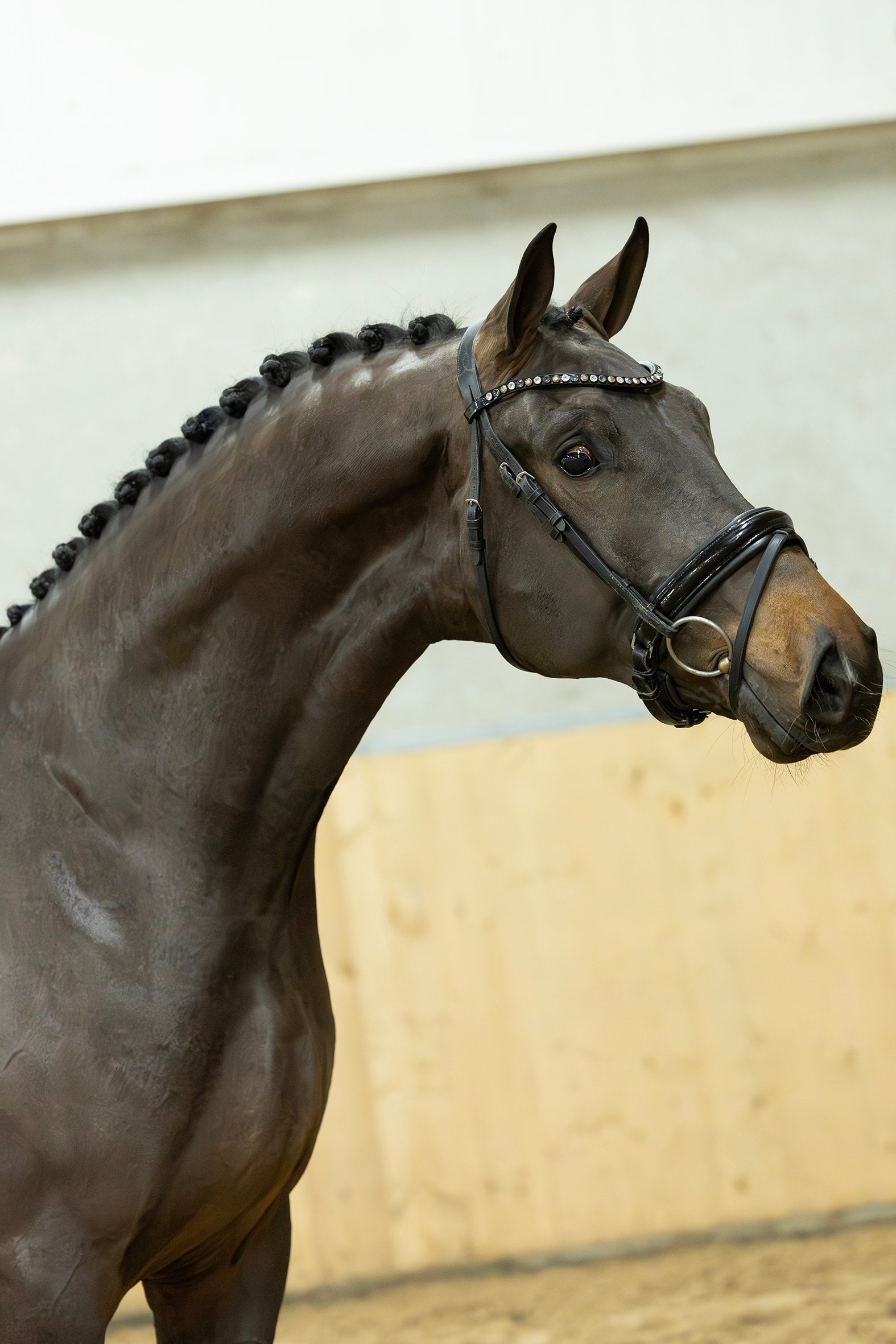 We have here a young gelding with a strong, well-developed build and attractive appearance. He comes recently out of the young horse group and he is completely green, has started learning the basic things. He moves in a correct and good way, with a strong and active hind leg. His big, relaxed walk is a real highlight. A very cool and promising horse to develop further for the future.