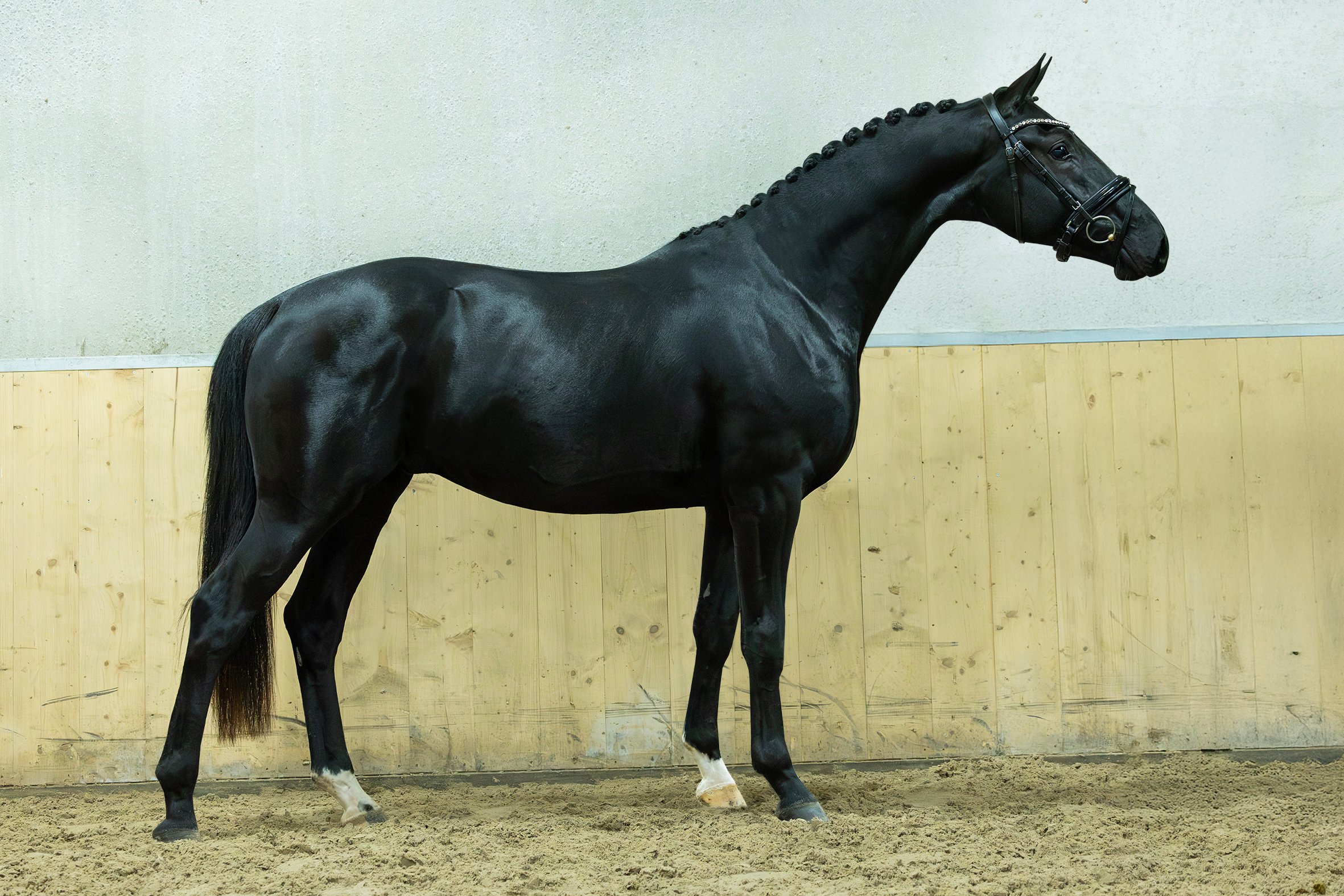 This young stallion is working very well on the lunge. He learns quickly, is focused, and to do his best. He has three good and correct basic gaits and a nice, modern type, which allows him to make a very pretty picture in his work. His movement is correct, balanced, and light-footed. With his correct movement and willingness to learn, he is ready to find his new home and continue his development.