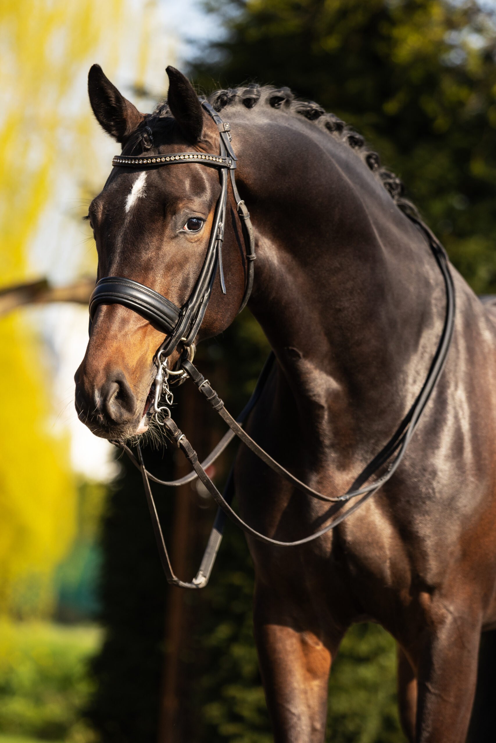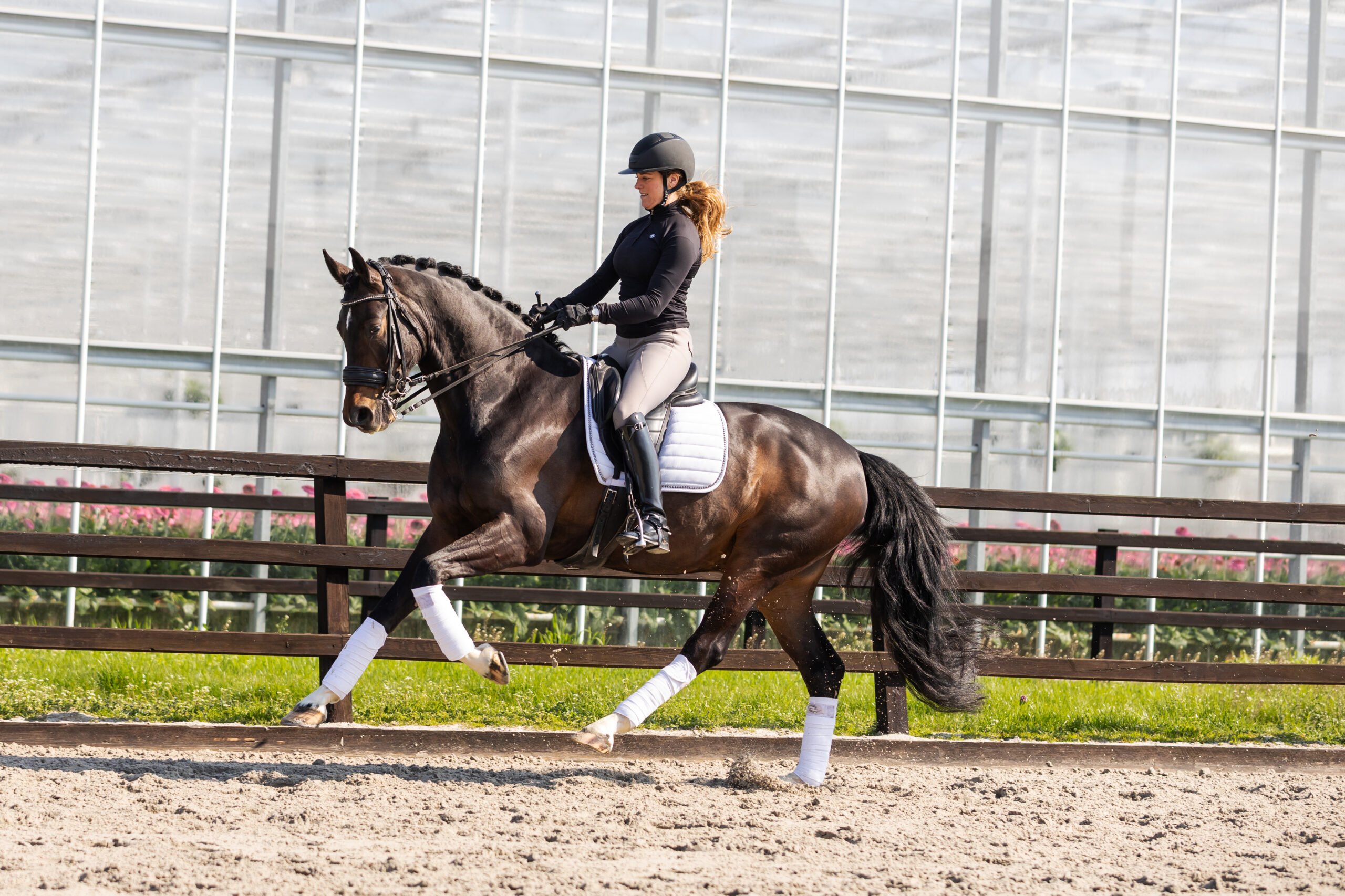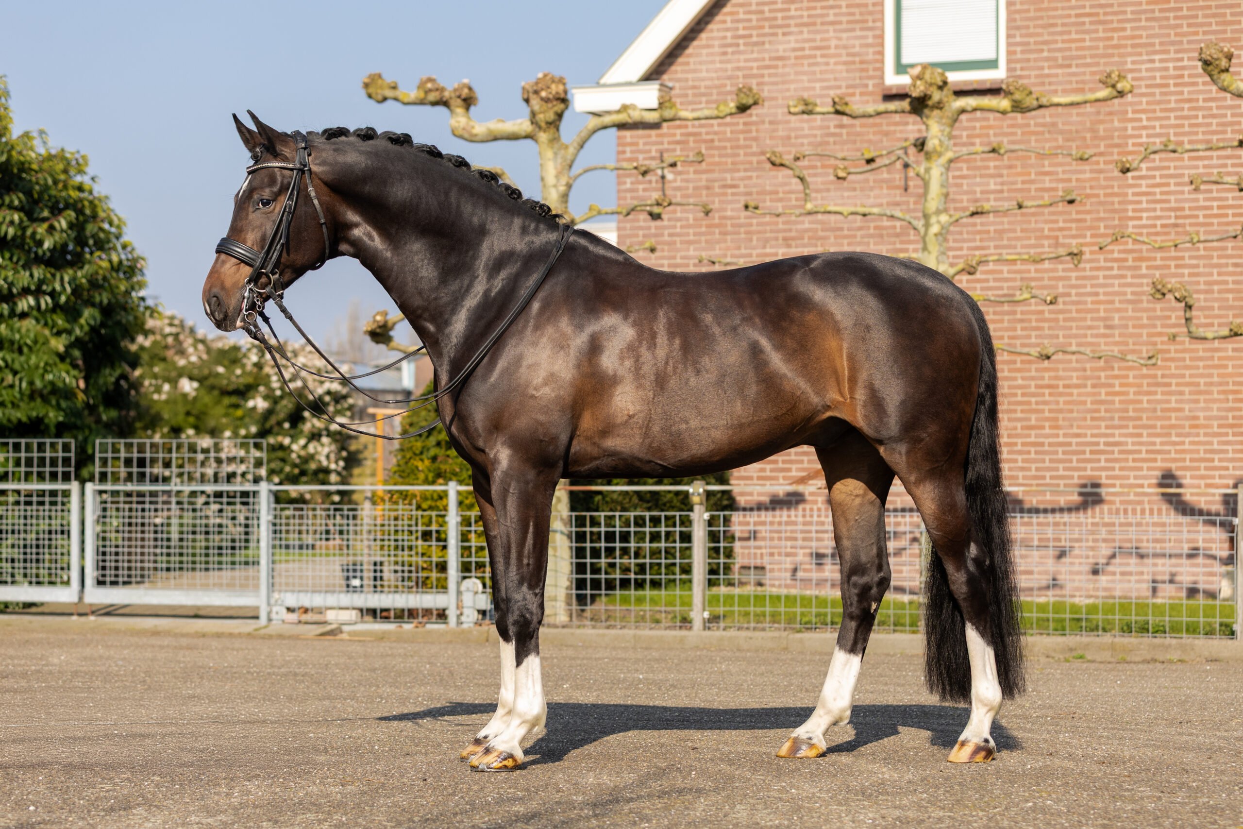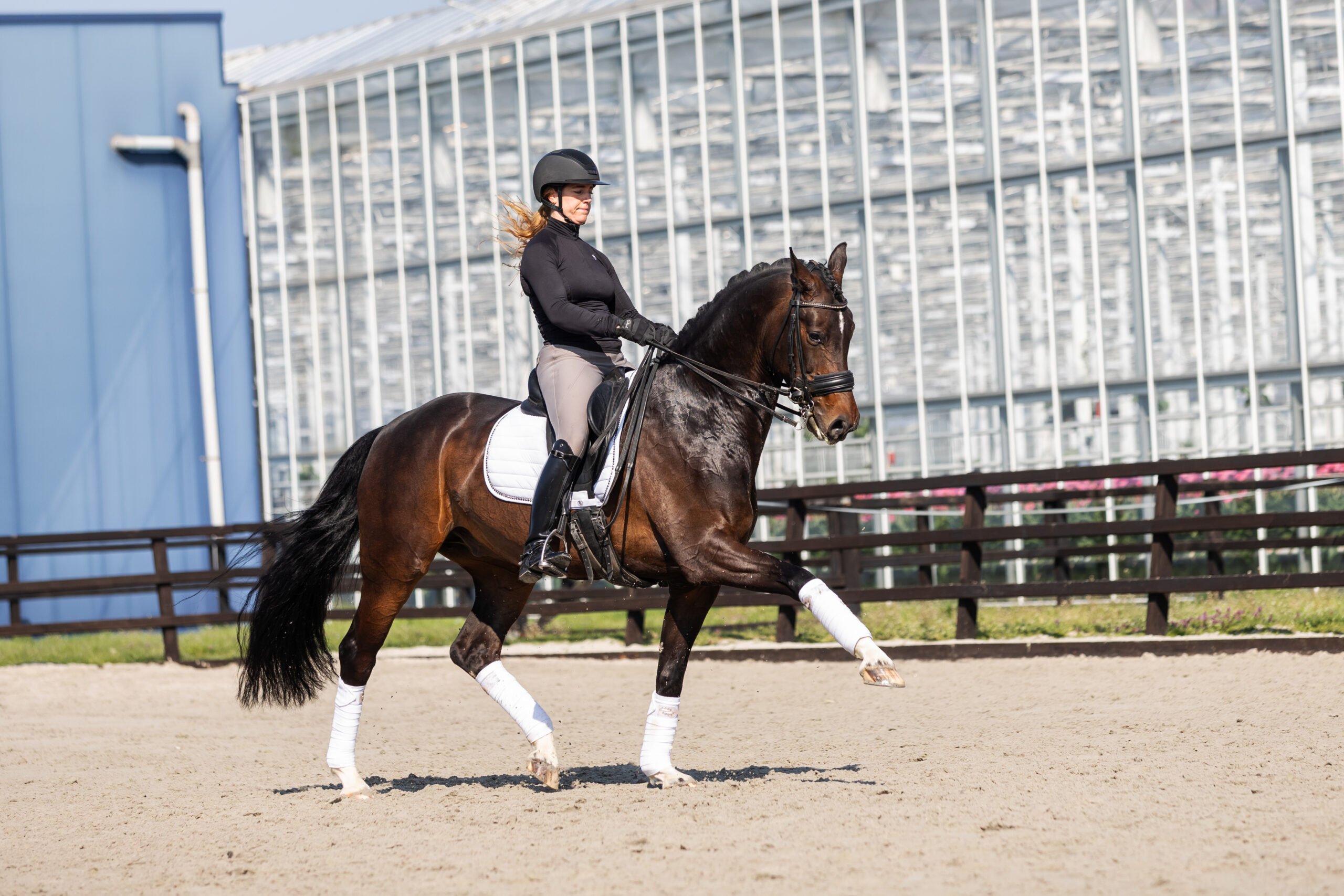 Woozers, we have a super handsome guy here. We love his four white legs and his build and type of horse, he is a real eye-catcher who loves to show himself. He is currently competing at Inter I level and has already lots of competition experience, making him a proven partner for the sport. He is a striking horse who combines power, energy and a natural way to move. He has a positive attitude every day, is always a happy horse and truly enjoys attention. In his work he has expression and needs a confident rider who can provide clear leadership, anyways he is always honest and willing in his work and is a joy to work with and to go on competition.